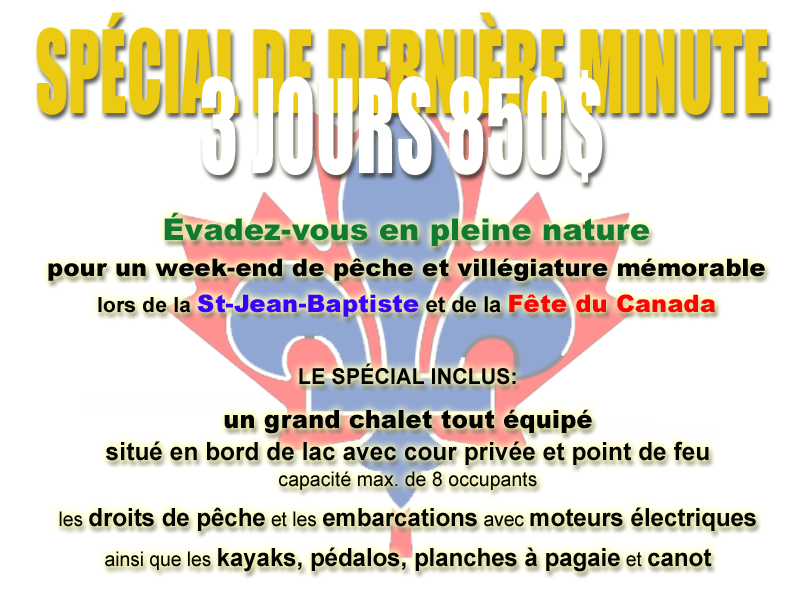 Facilement accessible à moins de 3 heures de Montréal; Pêche de qualité avec lacs de truites indigènes dont deux lacs dédiés aux enfants; une flotte de kayaks, pédalos, planches à pagaie et canot avec une plage et une plateforme flottante; un sentier de randonnée pédestre et de cani-rando; un poulailler pour y ramasser vos œufs frais; un module de jeux avec glissades et balançoires; le tout dans des chalets propres récemment rénovés et avec l’encadrement personnalisé et le service attentionné d’une équipe sympathique, disponible et dévouée.